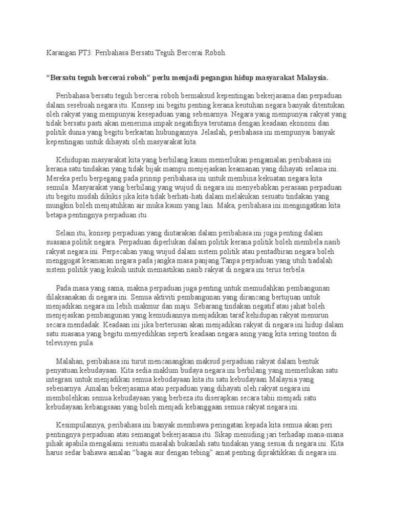 Contoh karangan bahasa melayu pt3 ini bukan sekadar untuk dibaca, tetapi perhatikan setiap penggunaan ayat, kata wacana penyelitan peribhasa . Sekolah menengah kebangsaan telok panglima garang moe. Peribahasa merangkumi simpulan bahasa , perumpamaan , pepatah , dan bidalan. ٢٦ جمادى الآخرة ١٤٣٧ هـ. Setelah beberapa minit mencampakkan mata kail ke dalam sungai, atan dapat memancing seekor ikan yang besar. Sebelum menulis karangan jenis ini, anda perlu memahami maksud peribahasa itu .